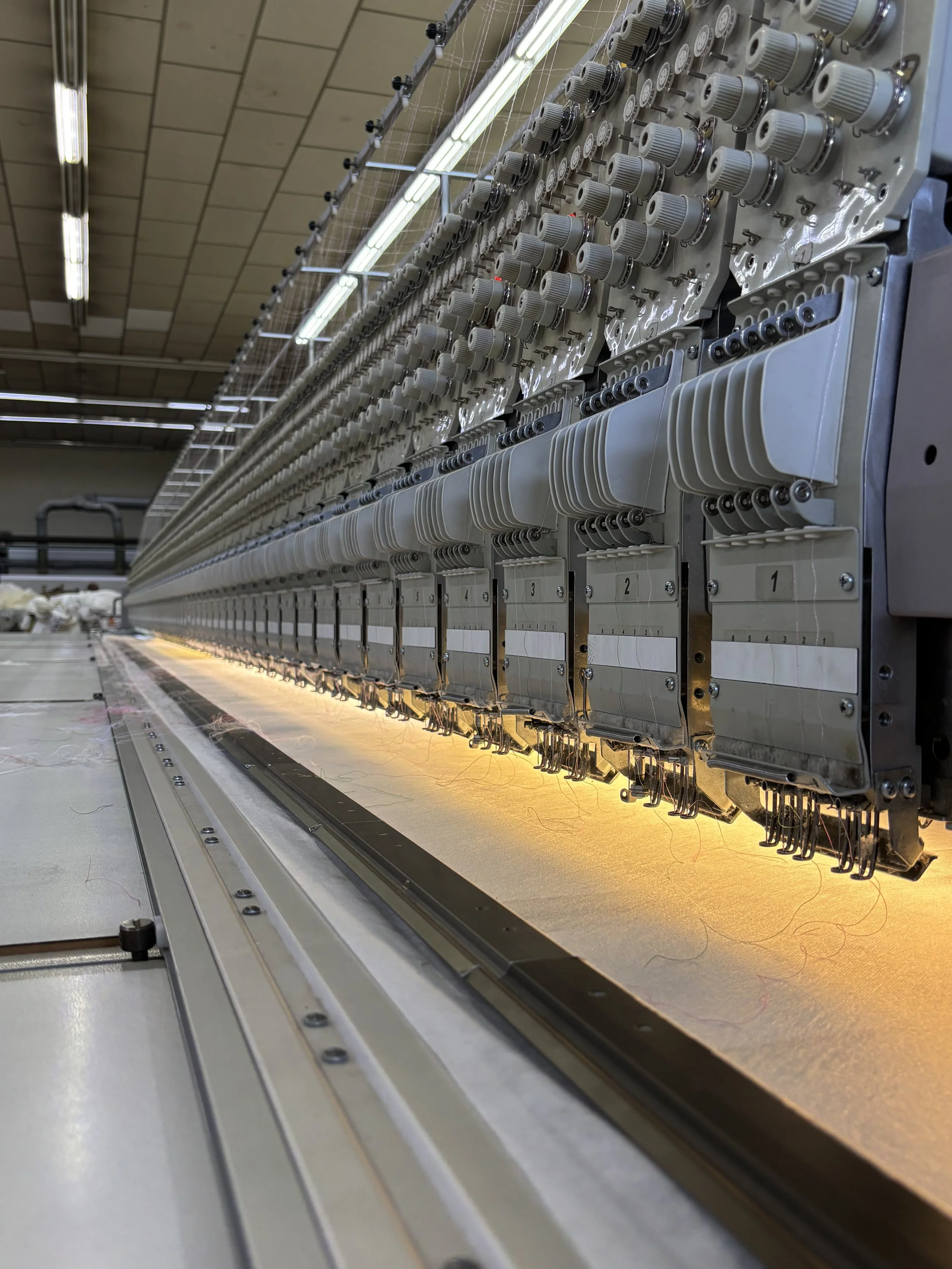 • CONTAMOS COM 1 MÁQUINA HORIZONTAL COM UM CAMPO DE BORDADO DE 900CM X 150CM DE PROFUNDIDADE E 56 CABEÇAS, PERMITINDO-NOS CRIAR PEÇAS DE GRANDE PRECISÃO E DETALHE.